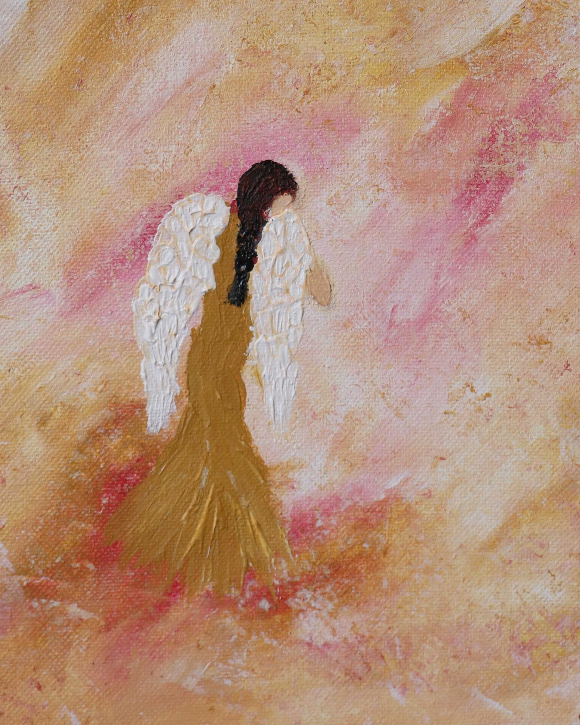 Swirls of pink and yellow fill the sky, capturing the graceful ascent of an abstract angel. Its flowing form and powerful wings seem to rise, evoking a sense of divine energy and spiritual awakening. The vibrant colors bring warmth and hope, while the dynamic brushstrokes create a feeling of movement and ascension. This painting invites personal interpretation, making it a striking piece for those who seek inspiration and meaning. Add a touch of the ethereal to your space and let this artwork uplift your spirit.