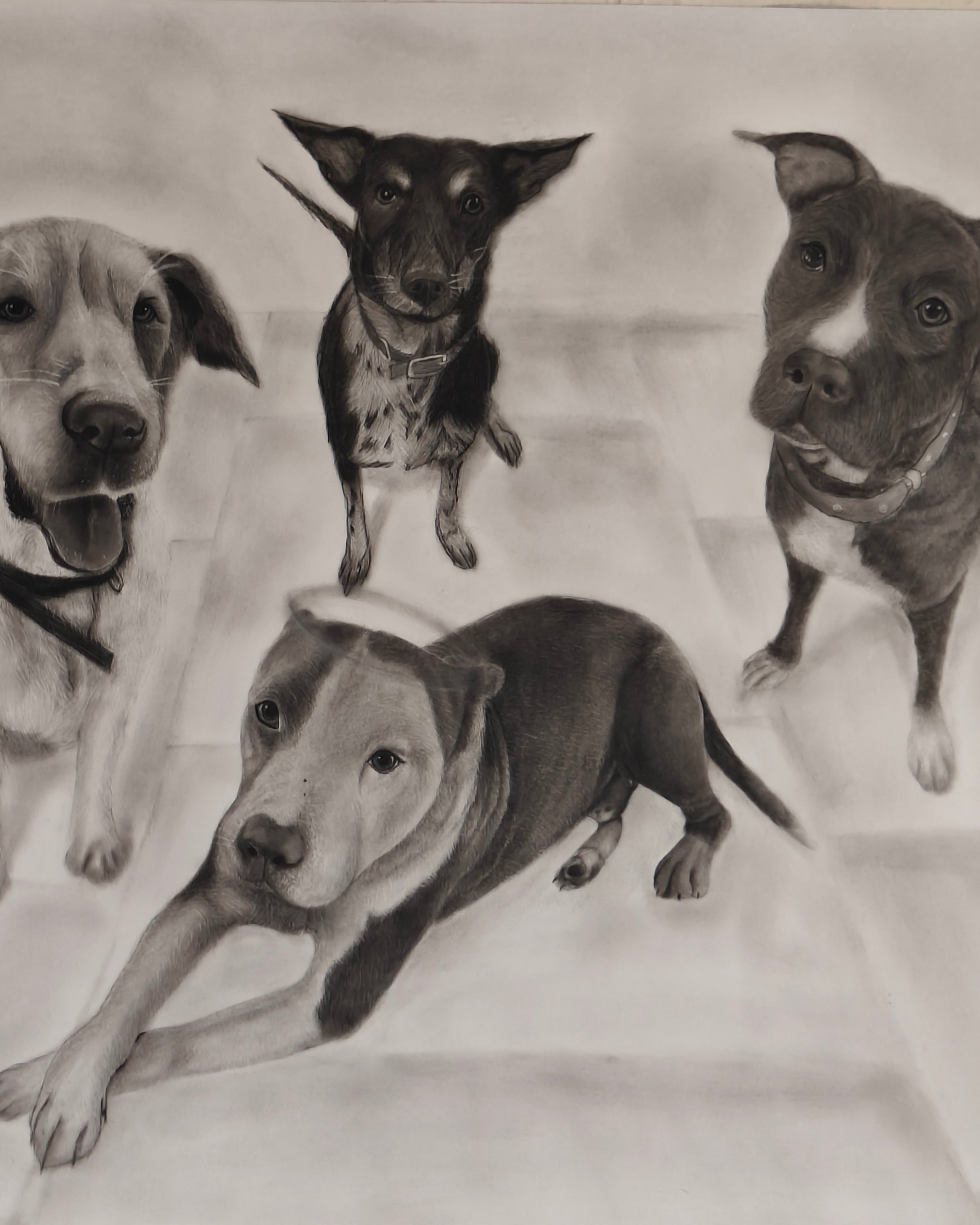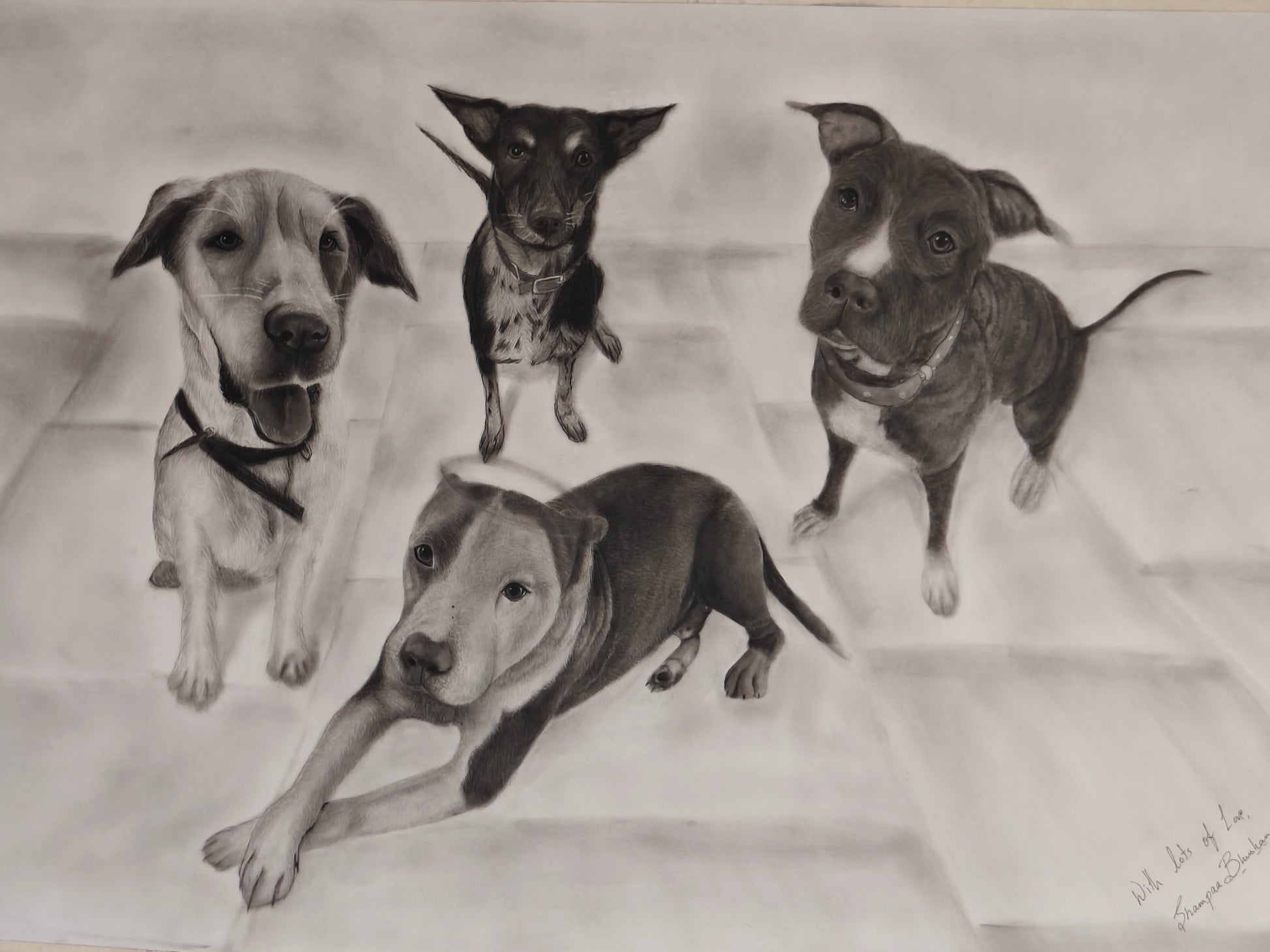 This was something very close to my heart, a friend's dog passed away while I was making this portrait, this is by far the biggest portrait I made. The dog in the left is my Godson. the goofiest bugger you can ever come across, unapologetic and loving. The oldest one with the Halo sitting down was the one who passed away and was the oldest of the lot. I got this opportunity to deliver this to her and her husband to which I cannot put in words about the reaction that I saw, even while typing this I have tears in my eyes. I love my job and what I can extract something like this from just sketching something. I feel blessed by God to have this skill. Buddy, Puppy, Meco and the Halo guy Logan. All are the good boys and girl of this family.