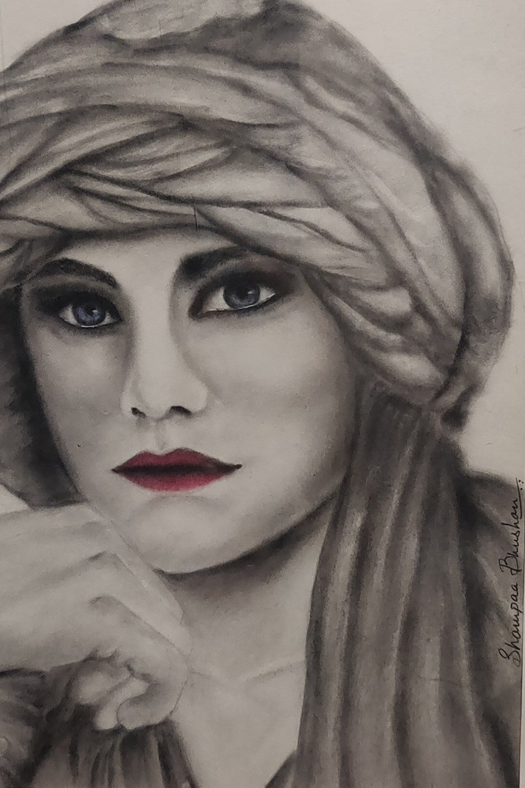 This striking sketch captures the elegance and strength of a woman adorned in a beautifully wrapped turban. Her eyes hold a story of resilience, while the delicate pencil strokes highlight the grace in her features. The turban, a symbol of heritage and confidence, adds an air of mystery and power to her presence. This artwork is a timeless celebration of femininity, culture, and quiet strength.