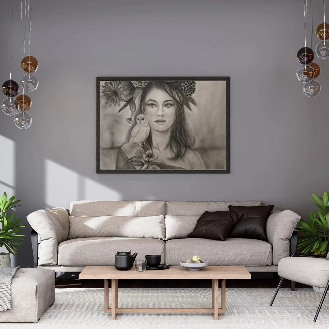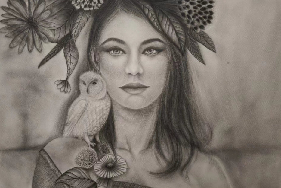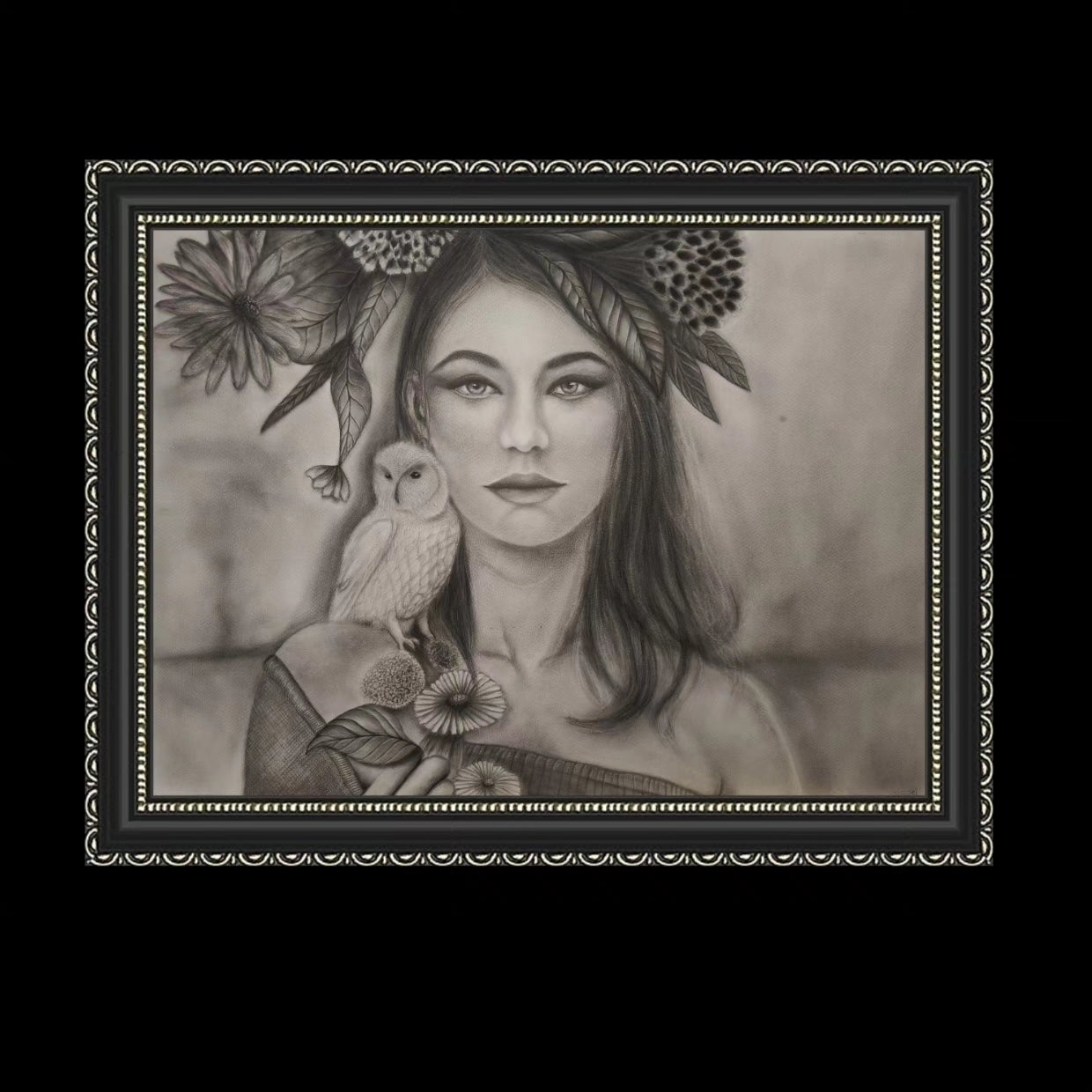 This artwork shows the deep trust between a bird and a human and the peace we feel when connected to nature. In a lush forest, a girl finds comfort surrounded by colorful leaves and flowers. An owl sits on her shoulder, watching over her like a quiet protector. This scene beautifully captures the magical bond between a person, an owl, and the wild.