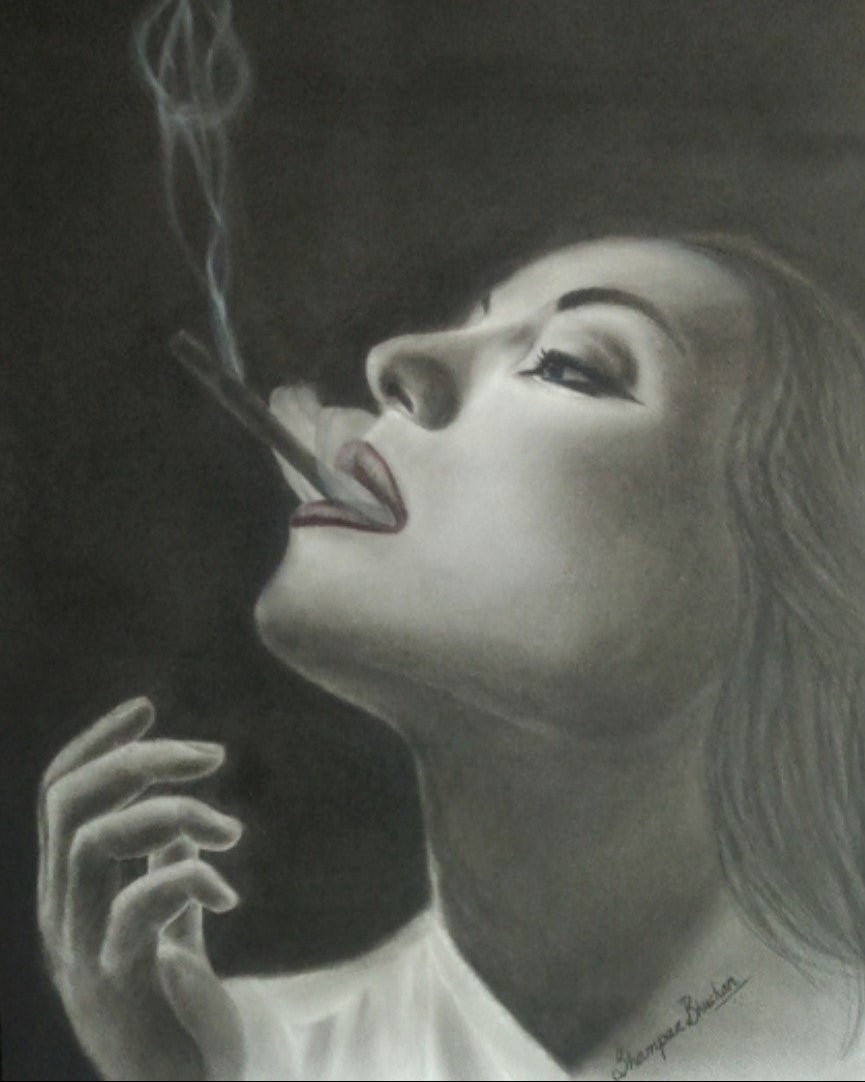 A charcoal sketch shows a strong, successful woman enjoying a quiet moment with a cigarette. The artwork captures the charm of small pleasures that come with success. But as the smoke rises around her, it also hints at the hidden dangers of unhealthy habits. This sketch reminds us to celebrate achievements wisely, without choices that may harm us. (Disclaimer: Smoking is injurious to health.)