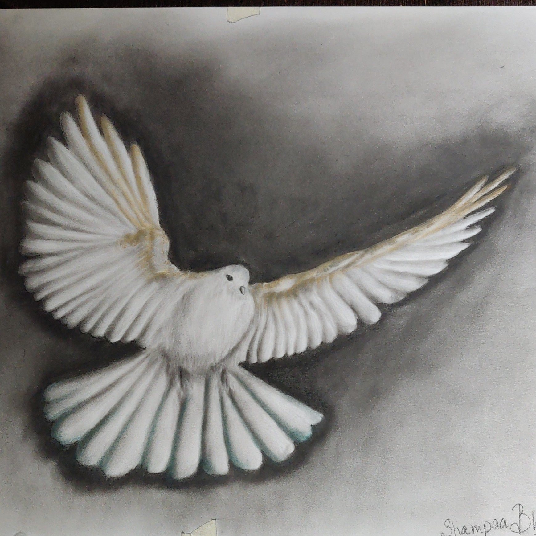 This realistic charcoal sketch shows a dove spreading its wings, ready to fly, proving that nature is beautiful even without colors. The dove has always been a symbol of peace and freedom, reminding us of its deep meaning. Its simple form carries a powerful message of hope and purity. Looking at this artwork, we feel inspired to break free from limitations and find peace in life’s chaos.