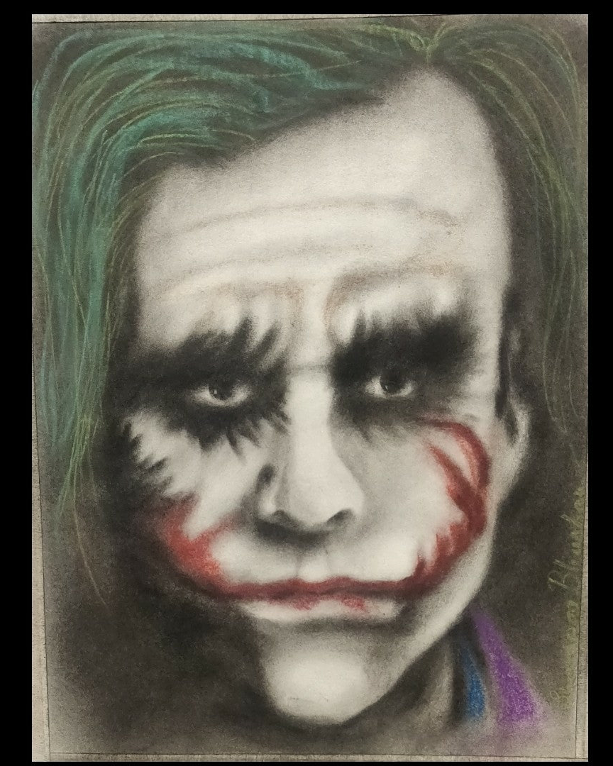 This powerful sketch brings the Joker to life with charcoal and colored pastels, capturing his eerie smile and intense gaze. The deep black of charcoal adds drama, while pastels highlight his bold makeup and wild costume. This artwork isn’t just a portrait—it’s a glimpse into the Joker’s twisted mind. Perfect for movie lovers, art fans, and anyone who enjoys bold, thought-provoking pieces.