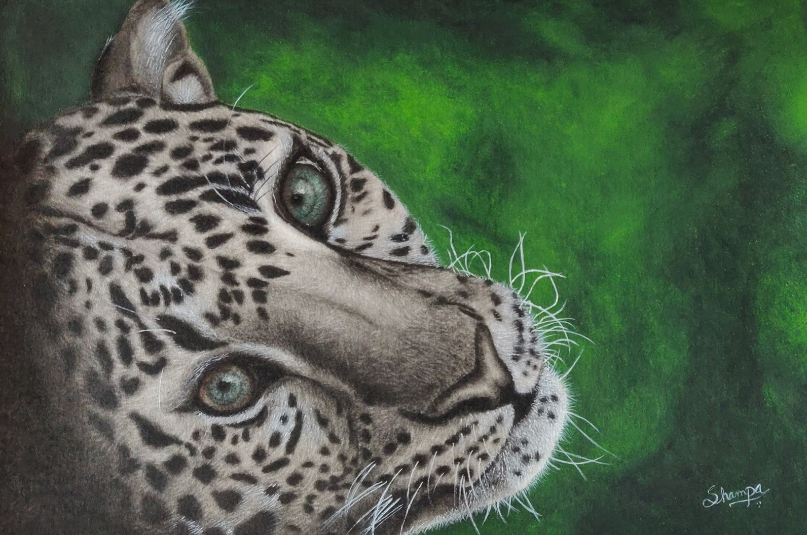 This charcoal sketch brings the mystery of the jungle to life. A leopard rests confidently among the thick trees, its sharp gaze full of power. I aimed to capture its beauty, from its sleek coat to its piercing green eyes. The black and white tones highlight its wild presence, with a soft green background adding depth. This artwork reminds us of nature’s balance—both strong and vulnerable, yet always breathtaking.