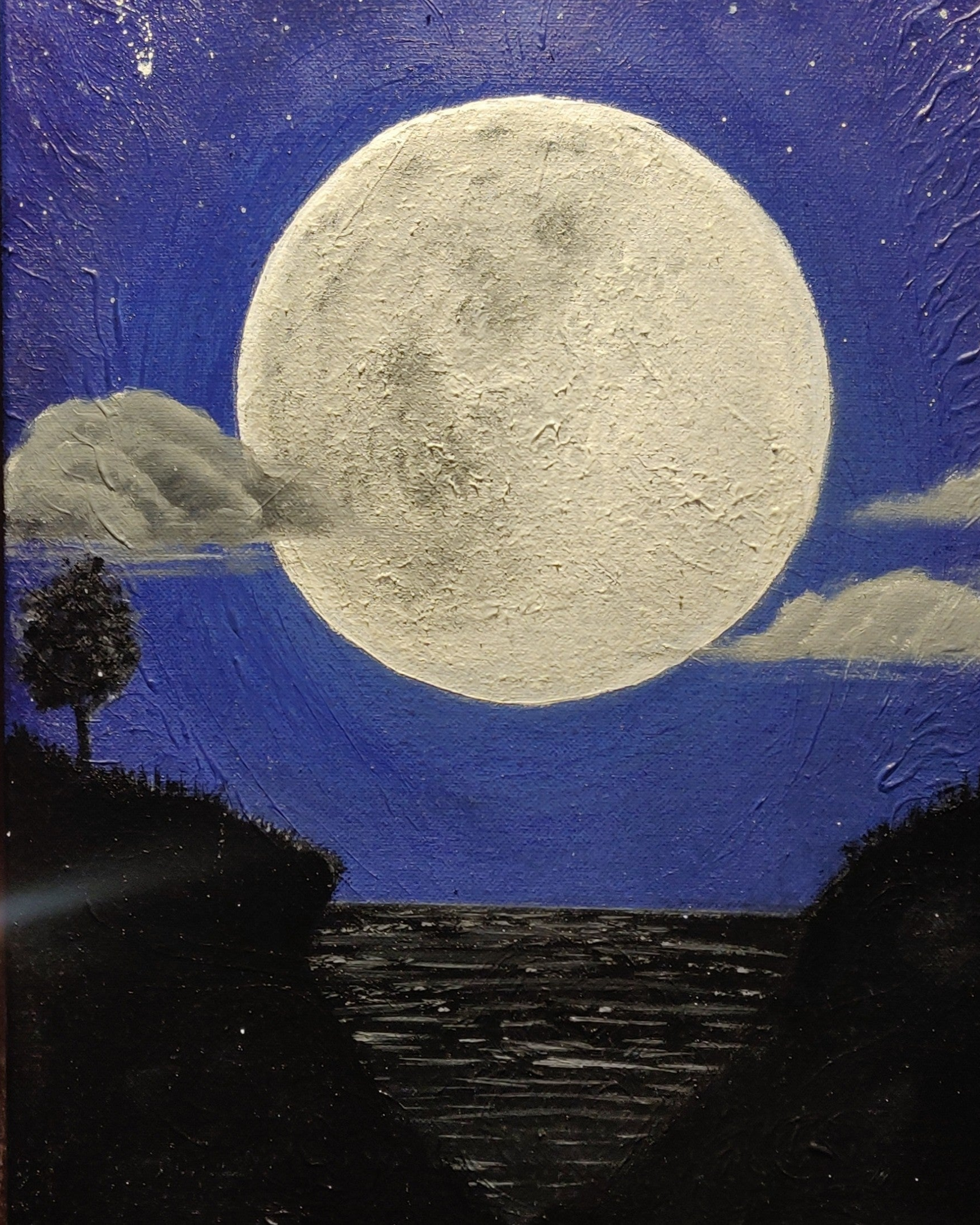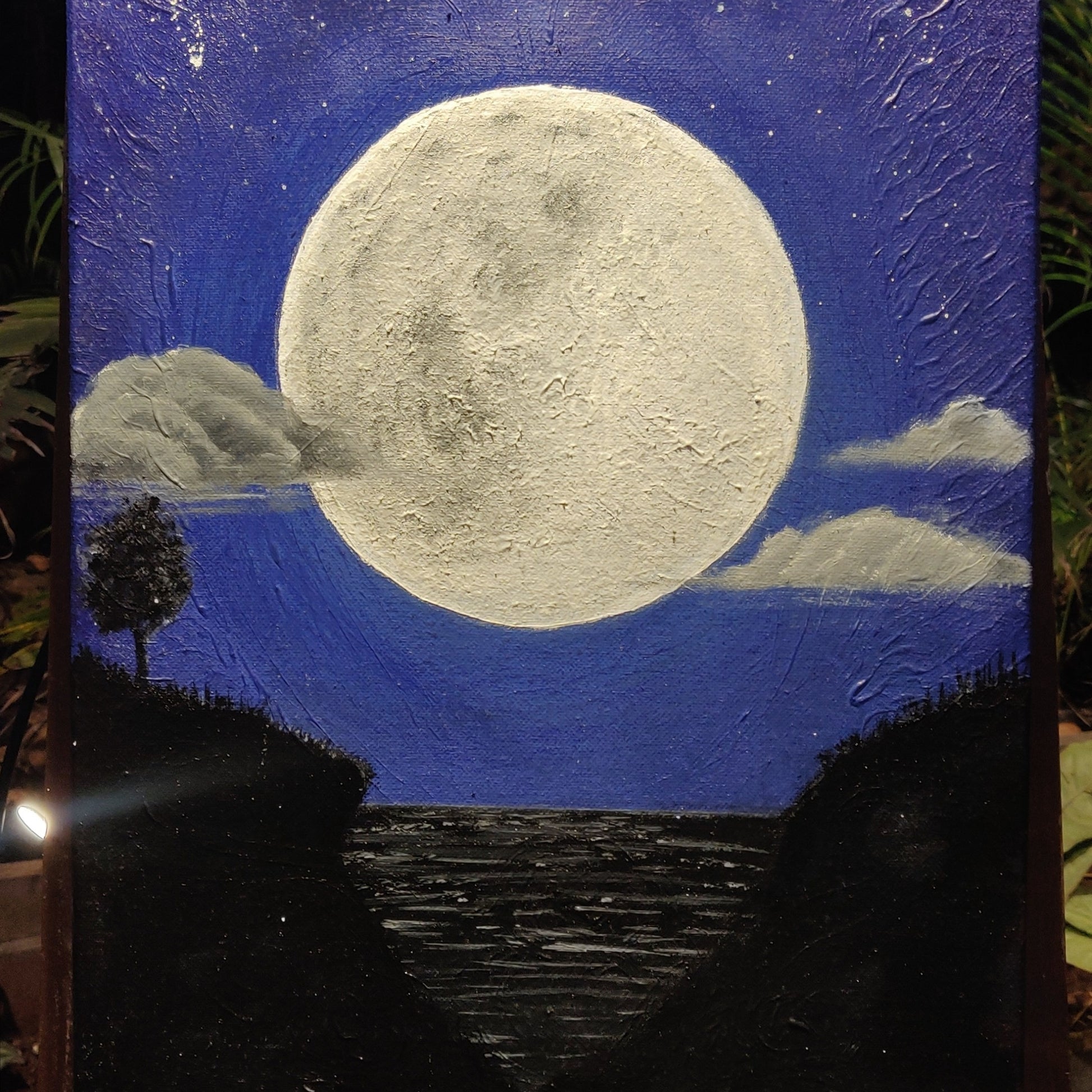 On a quiet night, a full moon glows over a still lake, casting its silver light on the water. A silent crowd stands on the shore, their dark silhouettes watching in quiet wonder. Their presence feels mysterious—are they dreamers, seekers, or spirits drawn to the moon’s glow? As darkness deepens, hidden details emerge, bringing the scene to life with a glow-in-the-dark effect. This painting is more than art—it’s an experience that invites you to step into its mystery and discover your own story.