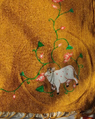 This hand-painted Pichwai saree set is a beautiful blend of tradition and elegance. The stole and a customized saree blouse feature intricate Pichwai artwork, a traditional Indian art form, making it a unique wearable masterpiece. It drapes gracefully and ensures lasting comfort. A perfect statement piece or a thoughtful gift for anyone who loves art and culture.