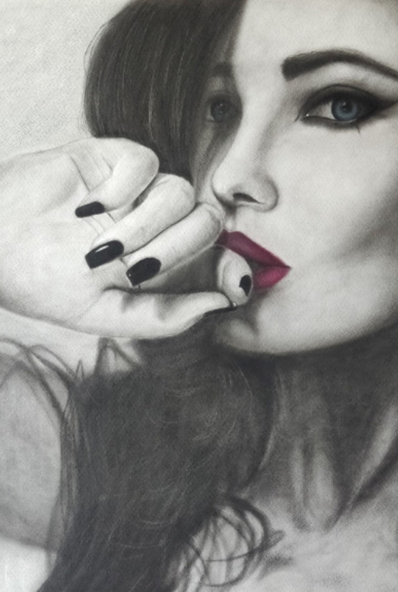 This artwork is part of a portrait series showing different human emotions. A sensual girl with an intense gaze draws viewers into her mysterious world. Her long hair falls gently over her face, adding to her charm and intrigue. The sketch beautifully captures desire and deep emotions, making it both captivating and thought-provoking. It invites viewers to explore the power of attraction and the complexity of human feelings.